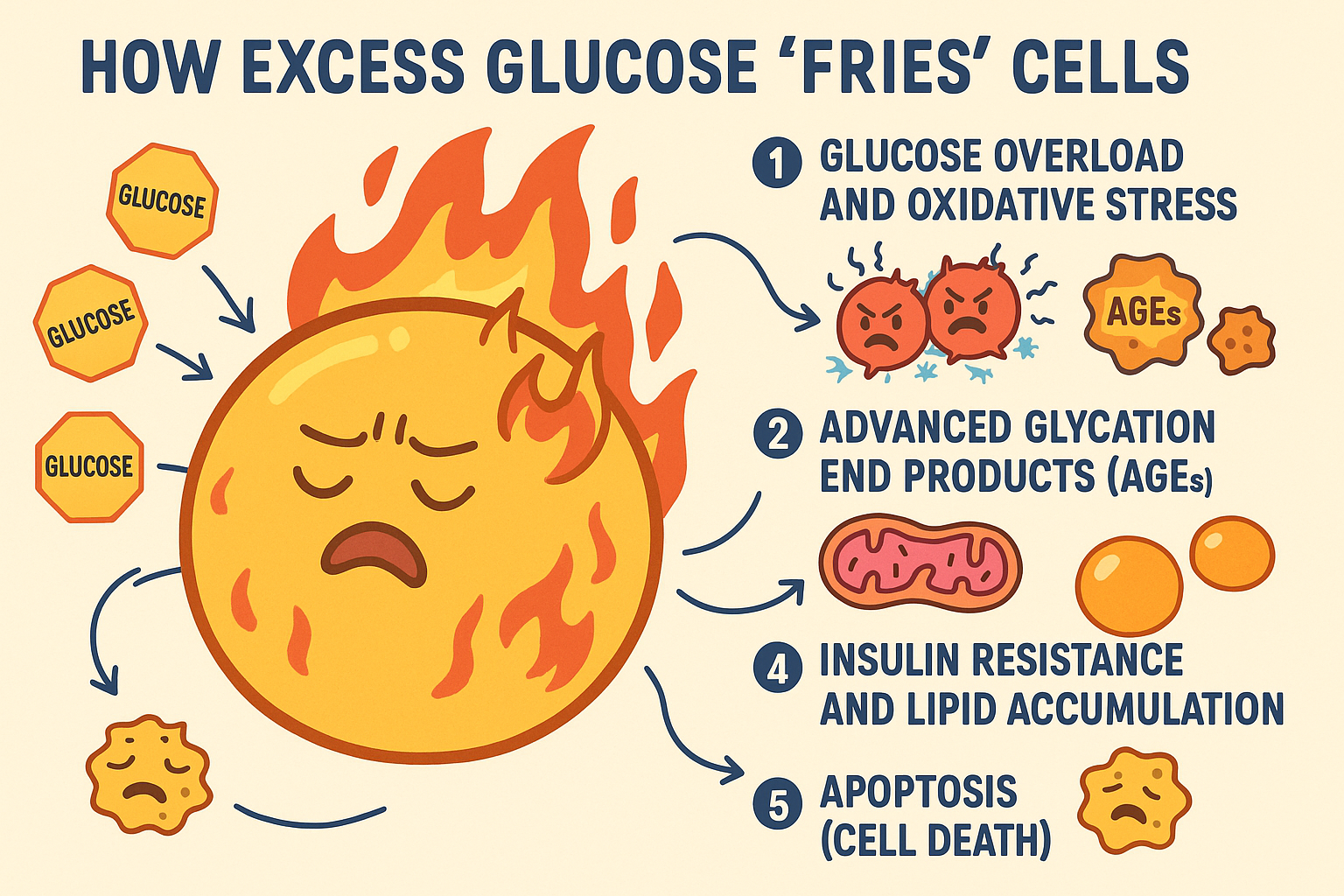 When cells are overwhelmed with glucose, they start producing excess reactive oxygen species (ROS) — unstable molecules that damage DNA, proteins, and cell membranes. This process is known as oxidative stress.